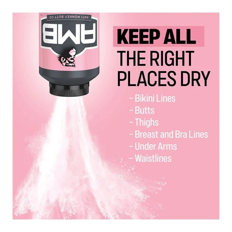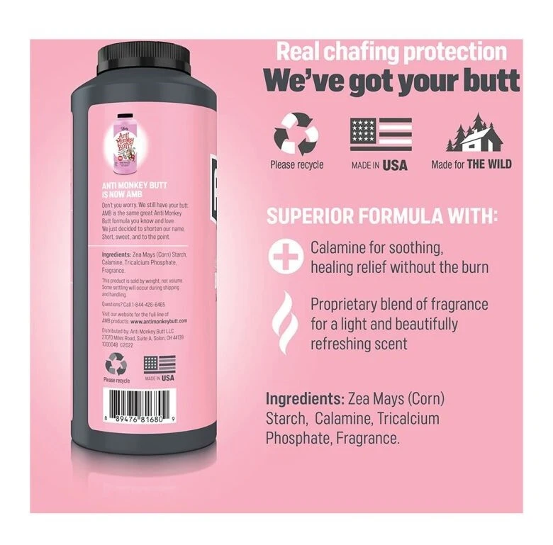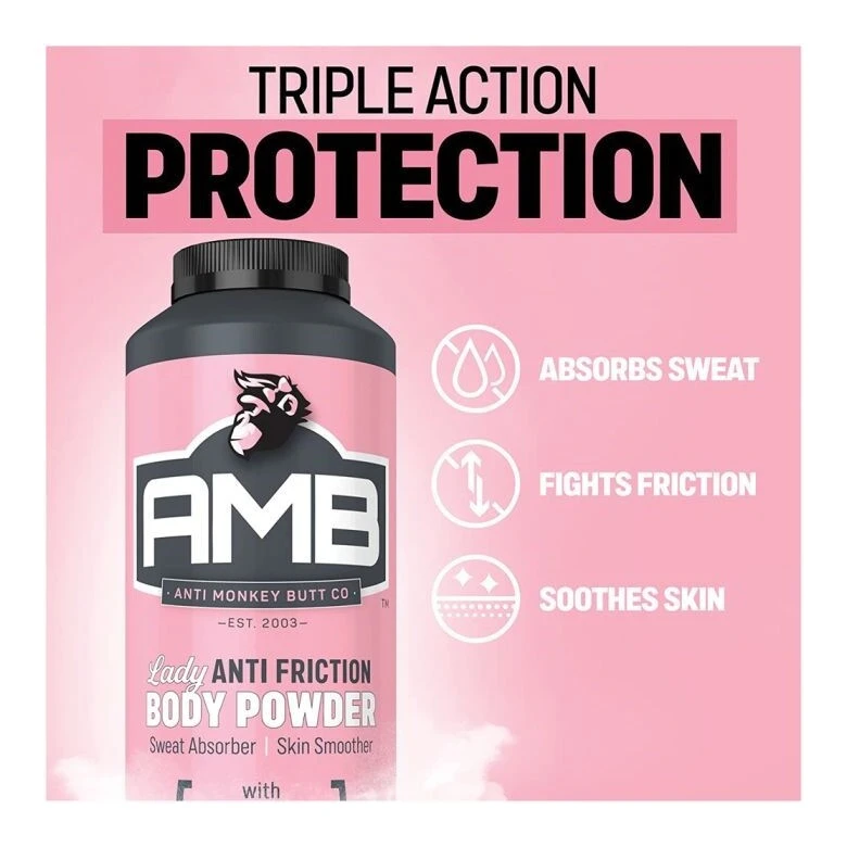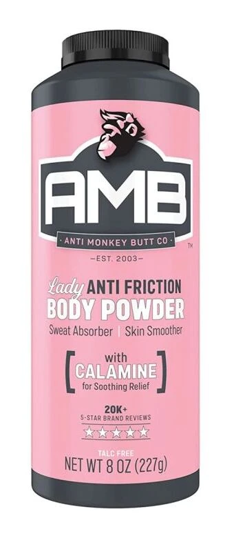 Lady Anti Monkey Butt Anti Friction Powder is specifically formulated for women. It works great on any areas that rub, like inner thighs, your bra line and perfect for when you need extra help in protecting against wetness. It contains cornstarch (talc free) and calamine powder. The cornstarch in Lady Anti Monkey Butt makes the powder go on satin smooth, while having a light, pleasant fragrance.