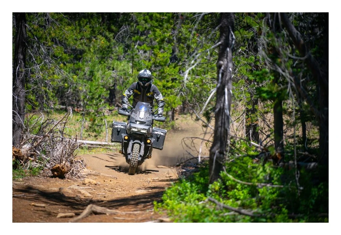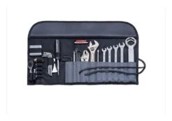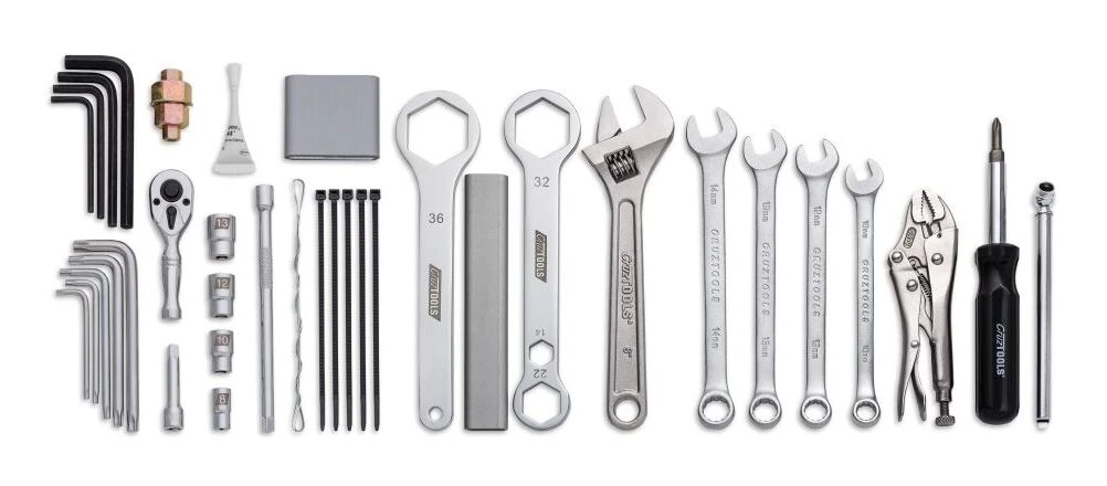 The RoadTech PA1 tool kit offers a precise and compact solution for Harley-Davidson Pan America owners looking to perform roadside repairs and adjustments. Custom-tailored to meet the distinctive fastener requirements of the Pan America, CruzTools presents a travel-friendly set, carefully curated to include essential tools while minimizing superfluous weight and bulk. The kit boasts professional-grade combination wrenches, an 8-inch adjustable wrench, locking pliers, a tire gauge, essential hex and torx keys, a versatile 6-in-1 screwdriver, a fine-tooth mini ratchet, extensions, and a socket set for diverse needs. A prominent feature of the set is the innovative 36mm Axle Wrench, paired with a lightweight aluminum extension designed to generate 12 inches of leverage, enabling the effortless removal of the high-torque axle nut. Accompanying it is a 32mm axle wrench, crucial for holding the opposite side of the axle stationary. The package also includes a 10x12x19x22mm combo axle adapter to facilitate front wheel removal. Tools stay neatly organized within a durable pouch that rolls up for easy storage on the motorcycle, making the RoadTech PA1 an indispensable accessory for the adventurous Harley-Davidson Pan America rider. CruzTools guarantees the quality of their tools with a no-questions-asked Lifetime Guarantee, ensuring that riders are equipped for the long haul.