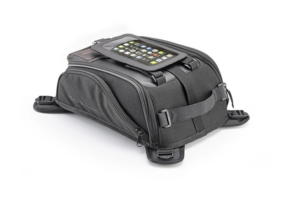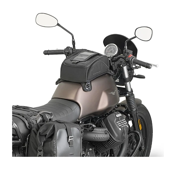 Designed with cafe racers in mind, the Corium Collection from Givi features timeless styling with coarse textured fabrics, simple lines and synthetic leather paneling. The CRM103 Tank Bag can attach to virtually any bike with its magnetic attachments or with its set of included straps. A removable smartphone holder keeps your phone in sight for navigation while a full waterproof rain cover keeps all of your gear protected.