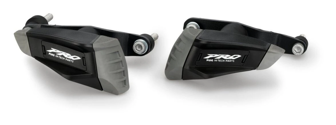 Puig Pro Frame Sliders feature a massive 130mm x 58mm Nylon puck. Each puck mounts via a billet aluminum bracket which requires no bodywork modification. To keep things clean, an end cap with the “PRO Puig” logo covers the mounting bolt on each puck.