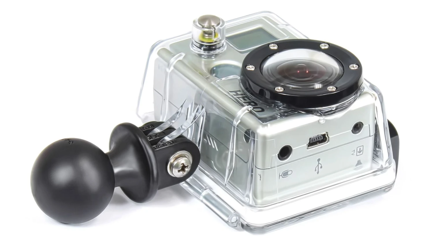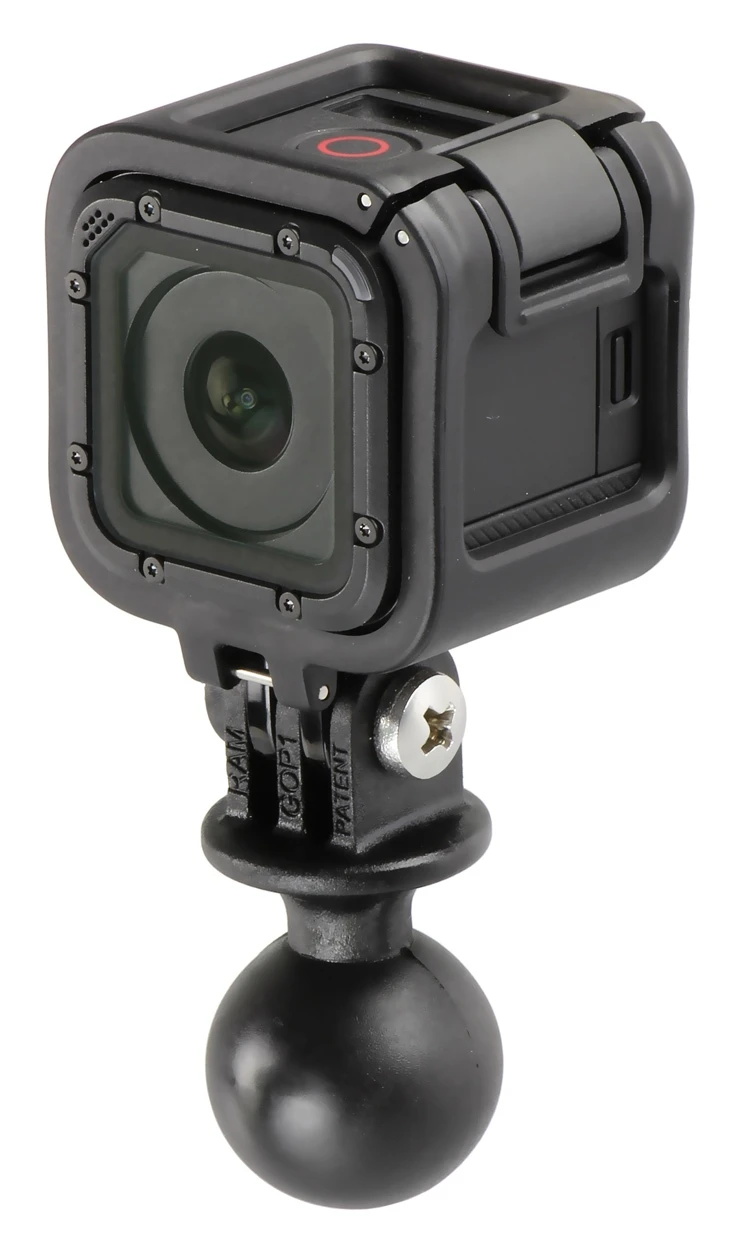 The RAP-B-202-GOP1 consists of a 1″ diameter rubber ball, connected to a custom GoPro® adapter. The adapter attaches directly to the under-side of the camera, replacing the factory mounting bracket.
