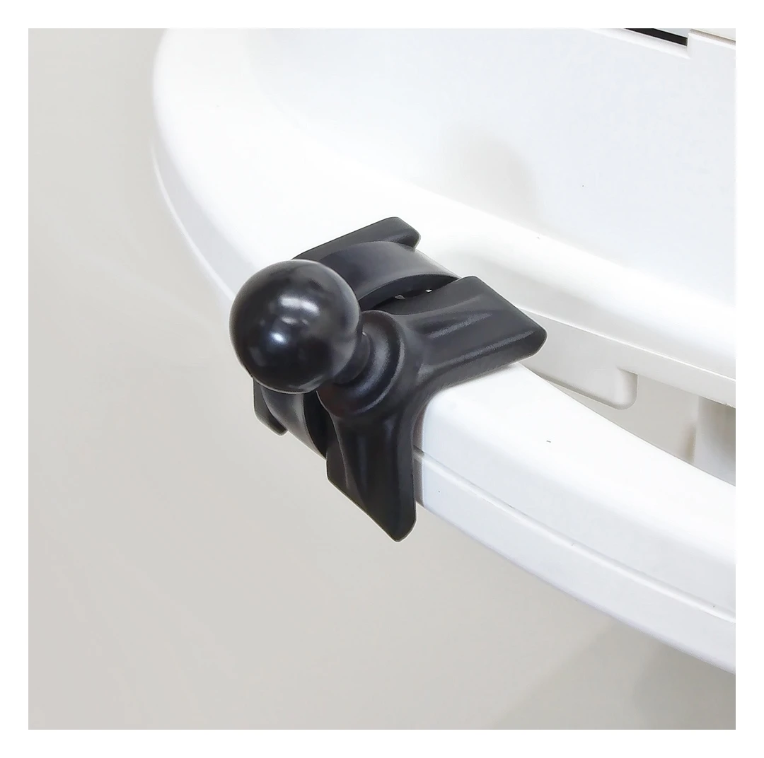 The RAM-B-108BU consists of a 1″ rubber ball connected at a right angle to a v-shaped base and accommodates bars from 1″ to 2.1″ in diameter. To mount the base, place the saddle- shaped V plate on the bar then wrap the metal clamp strap around the rail and plate. Tighten the screw knob on the metal strap with a screw driver until the strap has a firm hold on the rail.