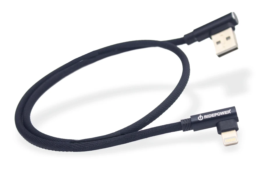 RidePower offers a rugged, durable charging cable, designed for the much tighter places or shorter connections between your phone and power source. This cable has a male USB connection on one end to quickly connect your USB socket and a male Lightning connector for your device on the other end.