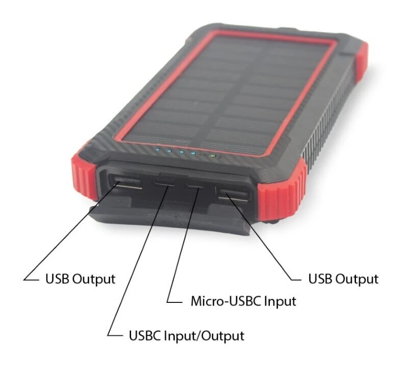 Note: The solar feature is for backup. Charge the unit when first opened with a 110 volt phone charger until all 4 lights are lit. Keeping it in the sun helps maintain the charge depending upon use.