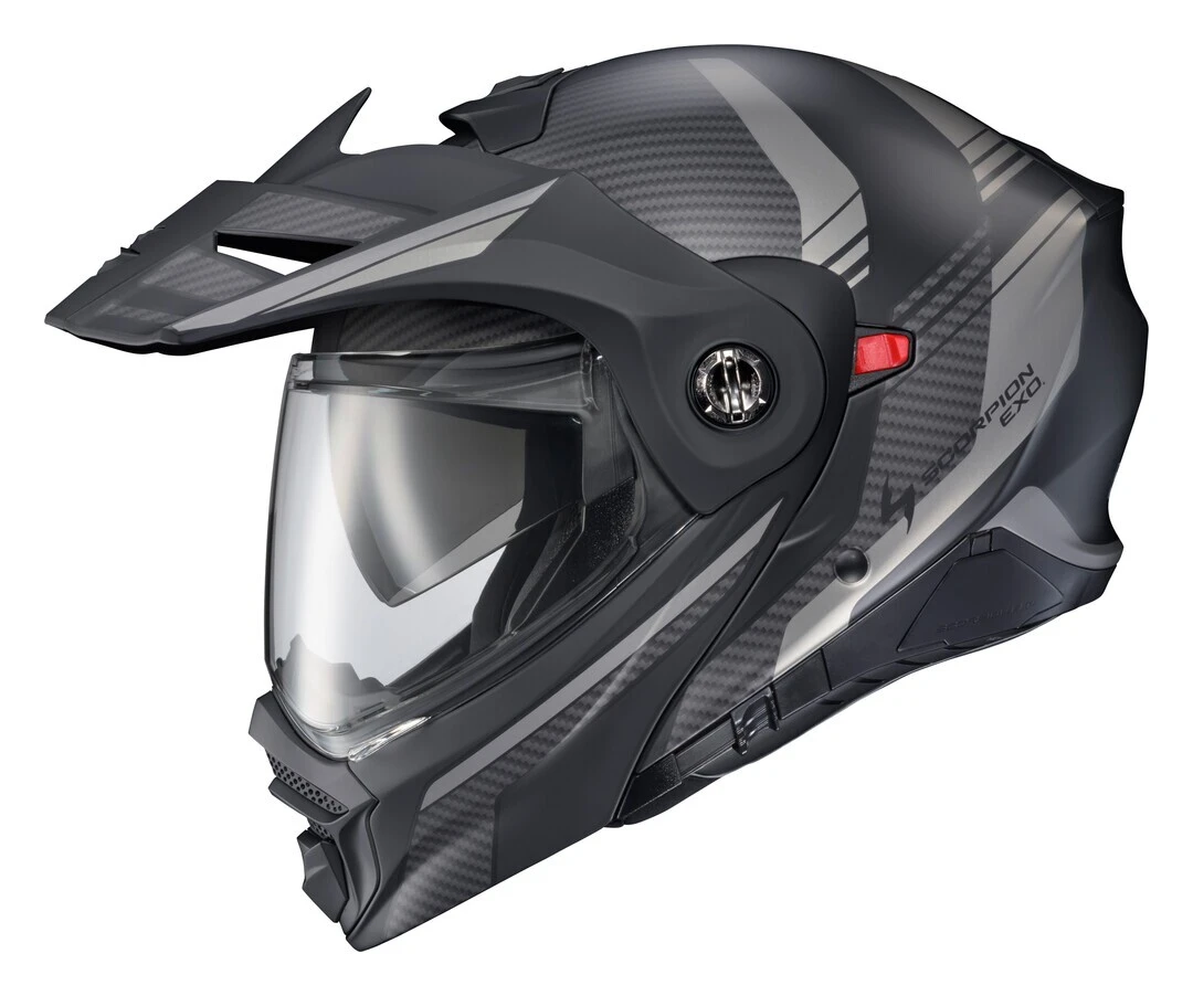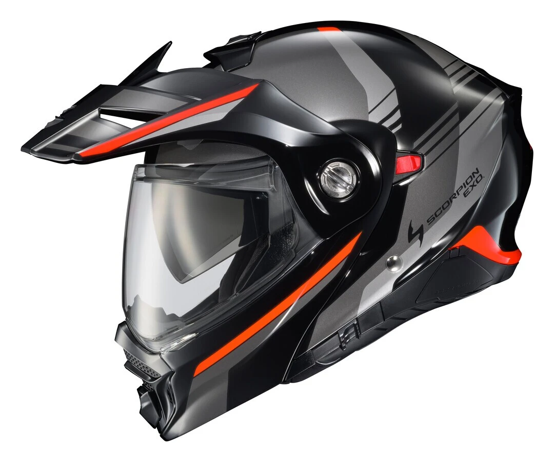 The Scorpion EXO-AT960 Modular Helmet has evolved from the super popular Scorpion EXO-AT950 Adventure Motorcycle helmet. The EXO-AT960 can be used as a full face ADV helmet with external peak visor attached, or the peak visor can be removed for a more aerodynamic touring helmet. An oversized eye port is extremely wide for greater peripheral vision and downward visibility, and the modular chin bar can be conveniently flipped up. The internal drop down Speedview sun-visor allows you to adjust to changing lighting conditions throughout the day. And for those who need to stay connected, the EXO-AT960 was specifically designed to integrate with the new EXO-COM BlueTooth Communicator Kit while the large speaker pockets also make it compatible with many other Bluetooth systems.