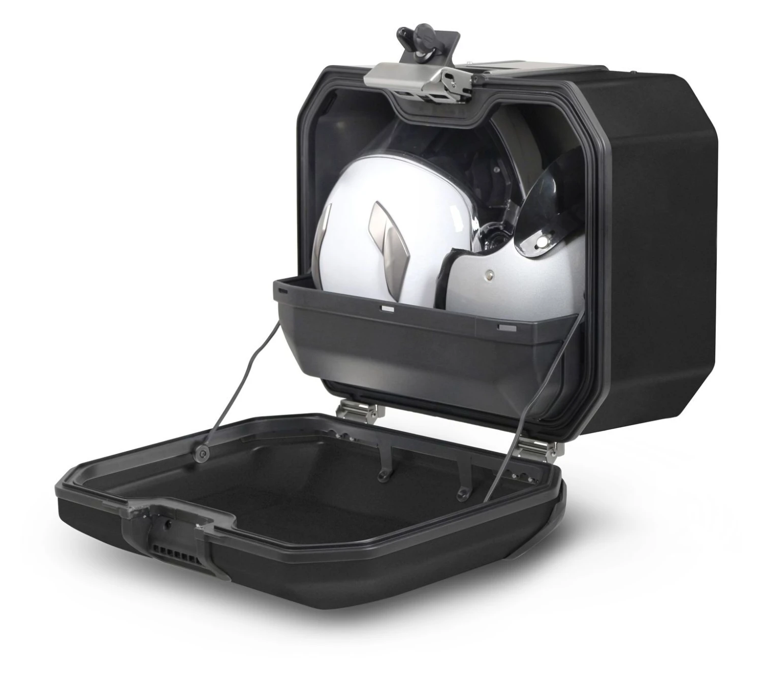 With forged aluminum construction and stainless steel hinges and locking mechanisms, Terra Cases are Shad’s answer to the calls of the Adventure rider. Terra Side Cases solidly latch onto Shad 4P or 3P-series side case racks using an array of C-channels that directly grip the over-sized steel tubing of the racks. This approach spreads the load and stresses over a larger surface area than traditional key-hole-and-nail-head type latching systems used by other manufacturers. Also diverging from the norm, these side cases open up like a clam shell, giving a rider quick access to all of their packed gear. Terra Cases use a single lock cylinder to open and close the case and disconnect the case from its rack.