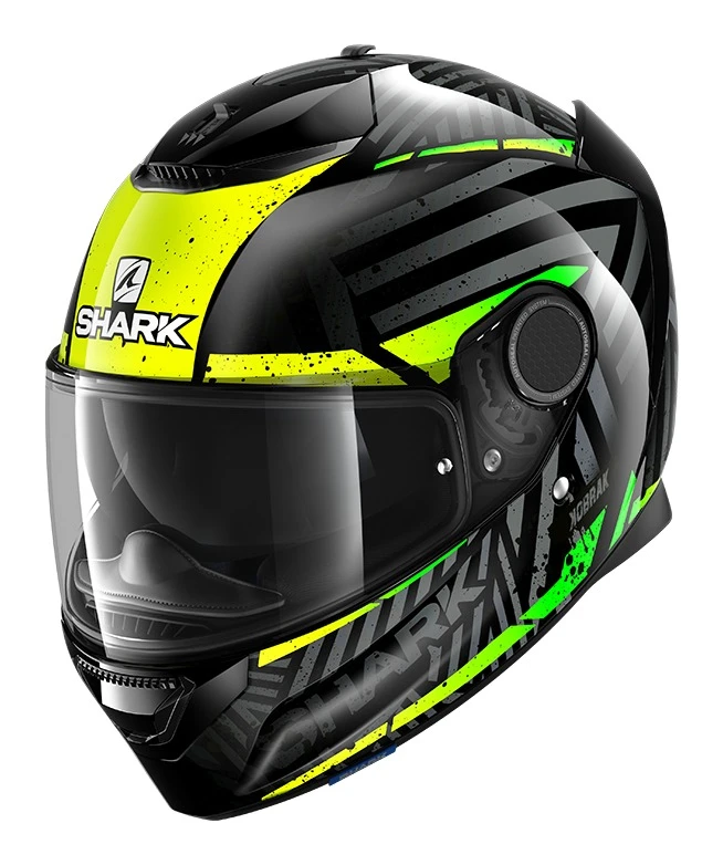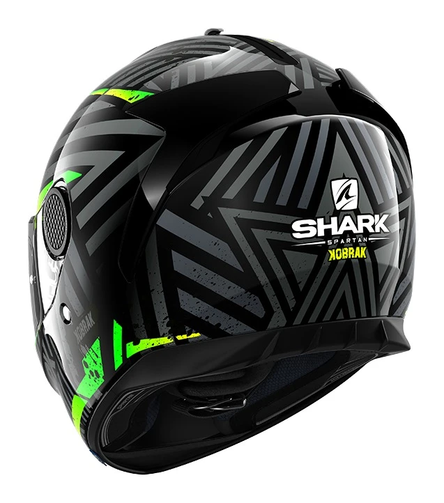 The Shark Spartan 1.2 Kobrak Helmet is an updated version of Shark’s heavy-hitting mid tier helmet, the Spartan. The Spartan 1.2 continues the tradition of the Spartan’s lightweight fiberglass shell and aerodynamically superior shape – honed by computerized fluids simulation and wind tunnel testing and then proven by Shark’s track helmets ridden in MotoGP, WSB and Moto2. Benefiting street, touring and track enthusiasts alike, the Spartan 1.2 eliminates a common source of whistling with lateral “Shark Skin” diffusers around the baseplate mechanisms and cuts turbulence at higher speeds with a split rear spoiler. Large ram-air intake vents located on the chin bar and crest channel cool air in as hot air gets expelled by the venturi created by vents just below the rear twin spoiler.