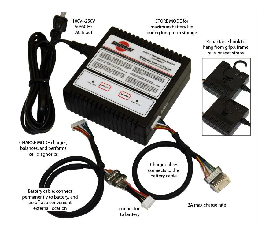 The Shorai Charge & Store Dedicated Battery Management System is designed for Shorai LFX batteries only. It has a 2A Max charge rate and connects via BMS 5-pin port on LFX batteries. Includes modes for full charge, or long-term storage.