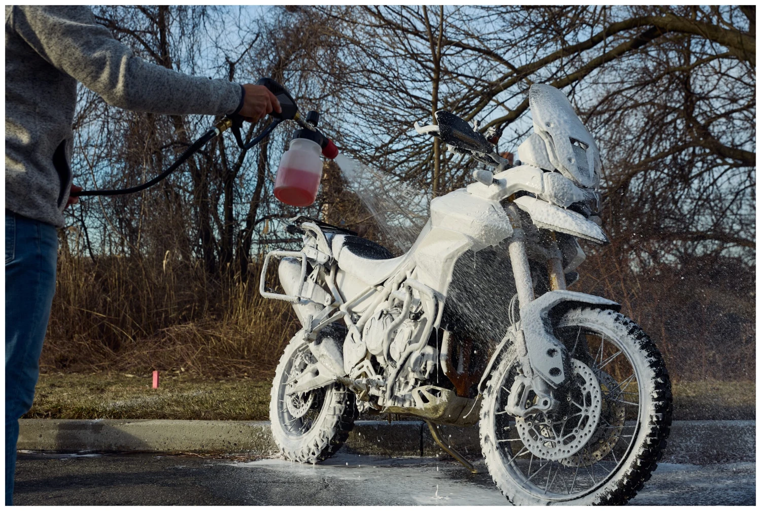 FULLY ALLOW BIKE TO COOL BEFORE WASHING. If it’s too hot to touch it’s too hot to wash. Not only do you risk hurting yourself but you also risk ruining the finish of your bike/exhaust/engine if the bike is hot while washing. If your bike is ceramic coated or has a fresh application of sealant or wax, please note that the foam may not cling to the slick surface as well. IMPORTANT: Foam cannons must be cleaned after every use to avoid clogging. Fill the canister with water only, then spray it through the pressure washer for at least 1 minute to ensure Supreme Foam Wash residue is fully removed from the foam cannon internals. Failure to rinse it out can cause soap to dry and clog the cannon.