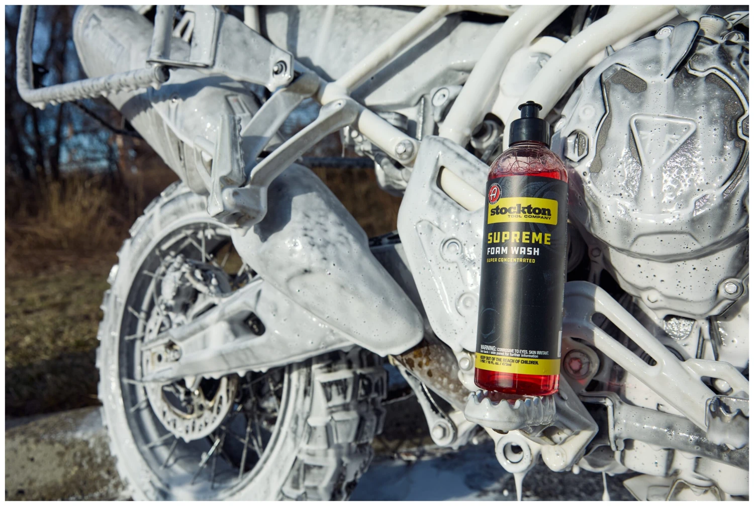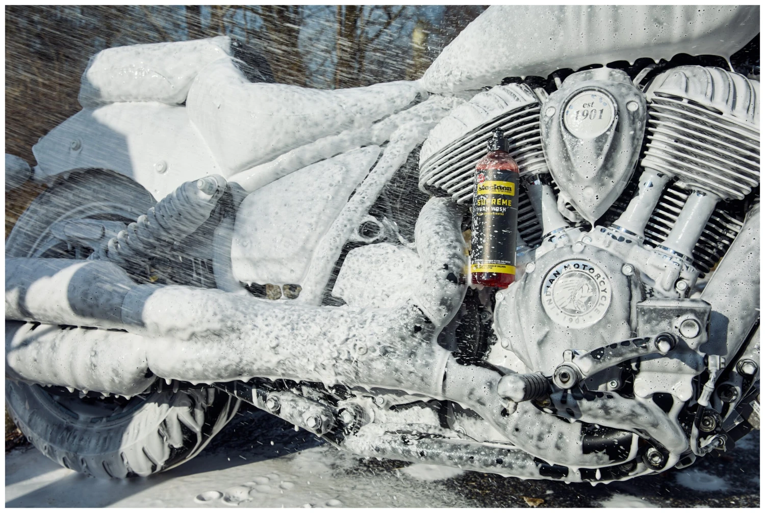 Allow Supreme Foam Wash to pre-soak vehicle, helping to loosen and lift dirt. Lather the bike with a soft and clean wash mitt, routinely rinsing to remove debris.