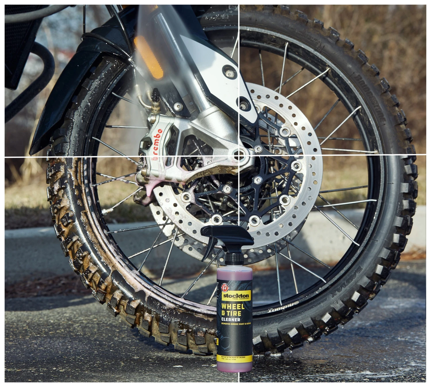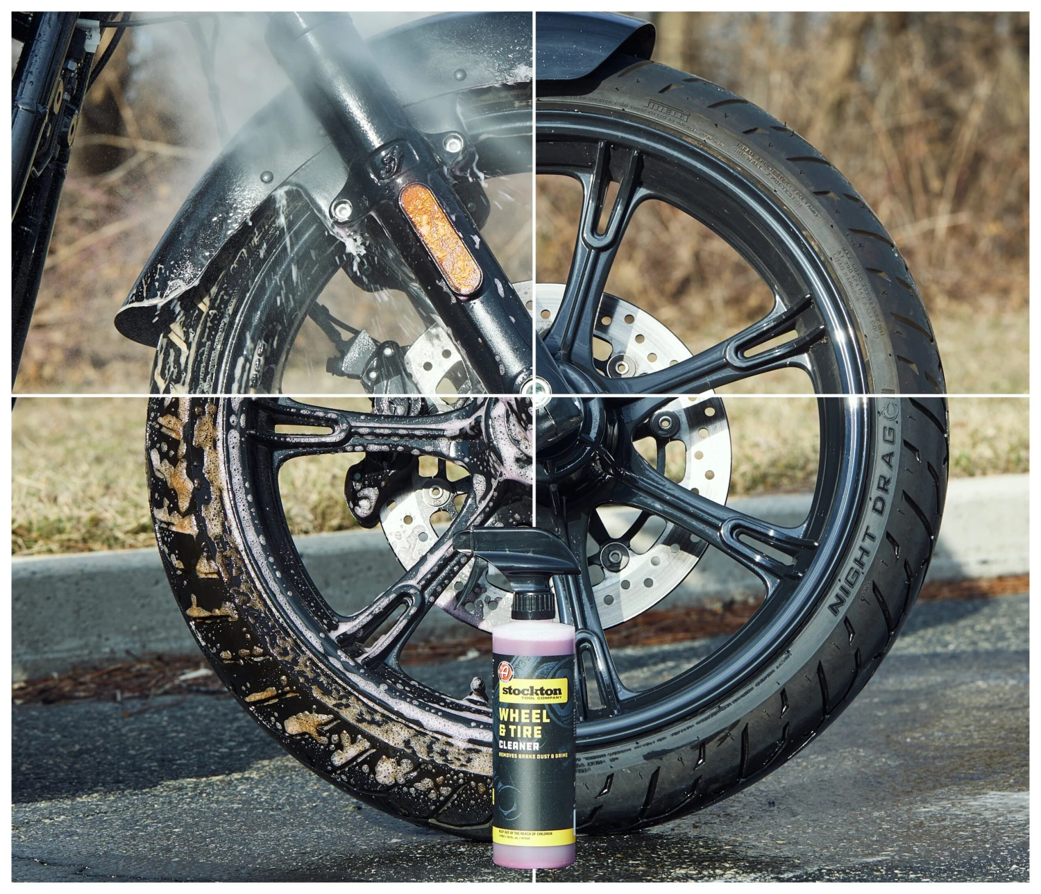 Stockton by Adam’s Wheel and Tire Cleaner combines two cleaning processes into one. Designed to make cleaning stubborn tires and caked up wheel contamination a breeze. This formulation specifically targets brake dust, chain fling, and brown / bloomed tires.