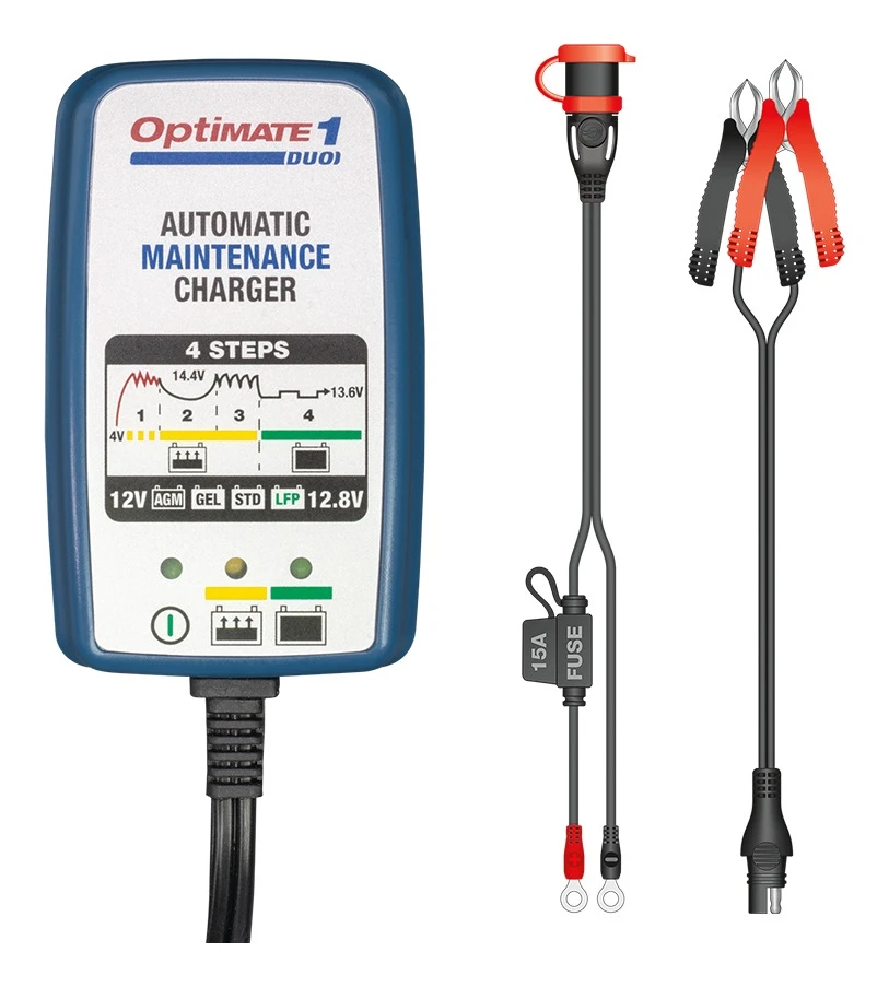 Ideal for standard lead-acid batteries, AGM and Gel batteries as well as Lithium batteries, the OptiMate 1 Duo is a fully automatic charger and maintainer. This complete kit includes a set of alligator clips as well as a fused battery harness. There’s an automatic shut down if short-circuited or the battery is disconnected.