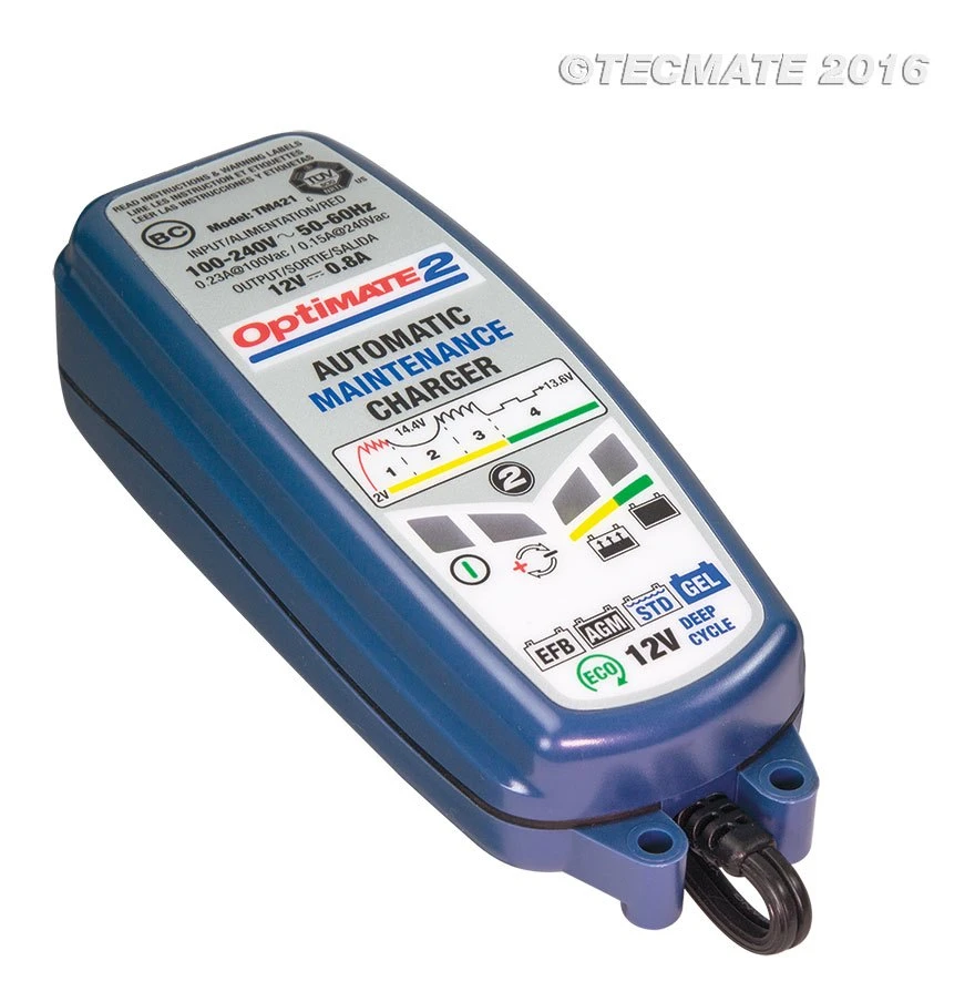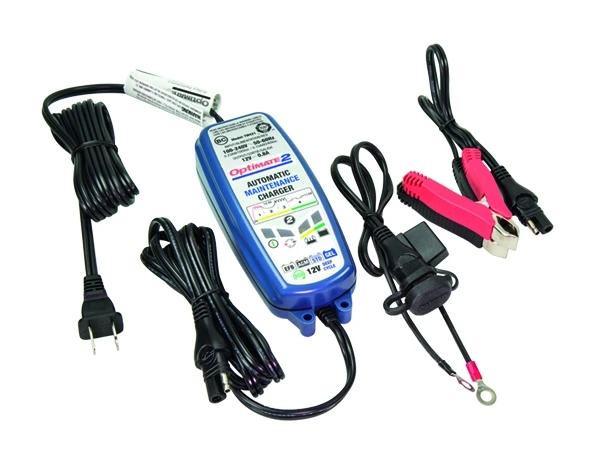- OptiMate 2 senses the battery condition, recharges and then keeps the battery 100% ready, never overcharging, and provides power to the anti-theft alarm, display, on board computer, etc