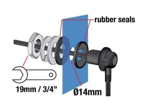 The TecMate Tank Bag Power Adapter Cable allows you to electrify your tank bag or to create a weatherproof power point on your hard luggage. Elbow connector fits through a 9/16″ / 14mm hole, thru connection is secured and sealed with custom rubber seal, M14 S/S nut & washer. Ideal for tankbags with power entry, such as Wunderlich Elephant, Hepco & Becker, SW Motech, and Touratech.